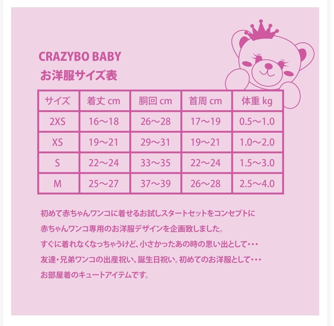 サイズXS:首囲(cm) 19-21、胴囲(cm) 28-31、着丈(cm) 19-21、目安体重 1~2kg