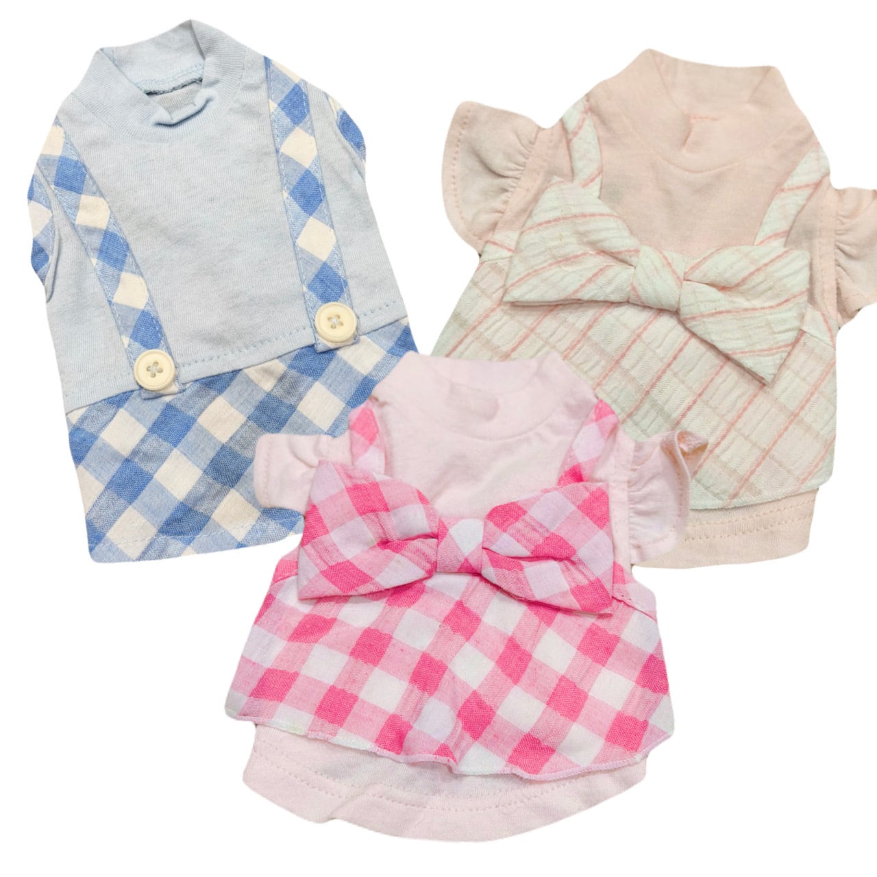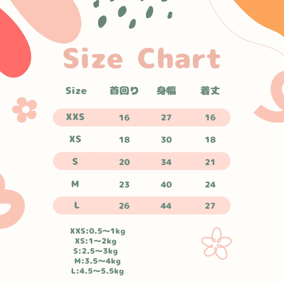 サイズXXS:首囲(cm) 16、胴囲(cm) 27、着丈(cm) 16、目安体重 0.5〜1kg